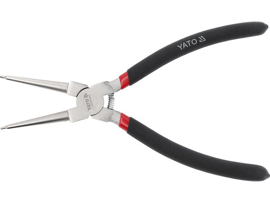 The pliers feature a polished and nickel-plated head finish, which enhances corrosion resistance and extends the service life of the tool. The PVC-coated handles offer a comfortable and secure grip, allowing precise handling during operation. Suitable for automotive and mechanical applications, these pliers are ideal for servicing engines, gearboxes, and other components that use internal retaining rings. The product is manufactured under the responsibility of TOYA S.A., located at Sołtysowicka 13-15, 51-168 Wrocław, Poland, and additional information can be obtained via info@yato.pl.